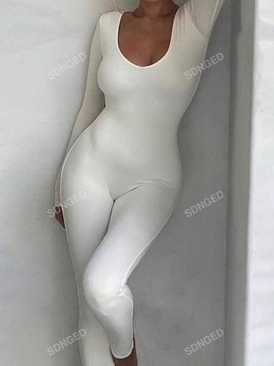 - ボディスーツ 女性用プレーン ネック 長袖 スリムフィット ジャンプスーツ ユニタード、デイリーウェア用