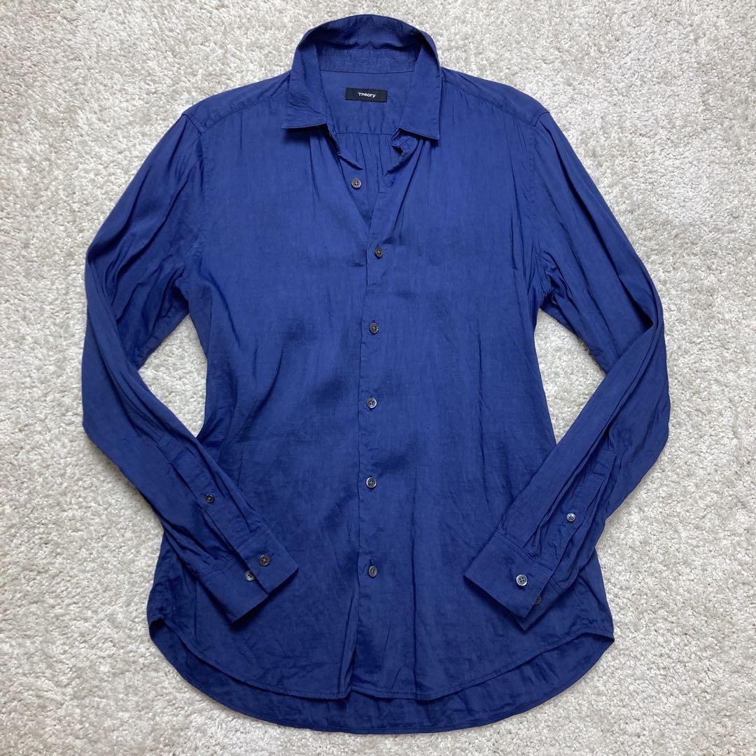- 小さめサイズ セオリー XS ネイビー 艶 リネン混 Theory 長袖シャツ シアサッカー メンズ シャツ S