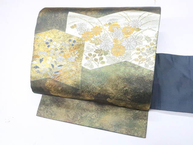 - 《京都一輝堂》【着物】九寸名古屋帯 太鼓柄 金銀糸 雲に草花文 25b04-779