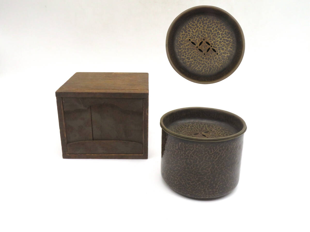 > K8835 黄銅 槌目 水盂 茶こぼし 銅製 建水 重さ約216g 合箱 茶器 古美術 銅器 香道具 茶道具 金属工芸 時代物 鉄瓶