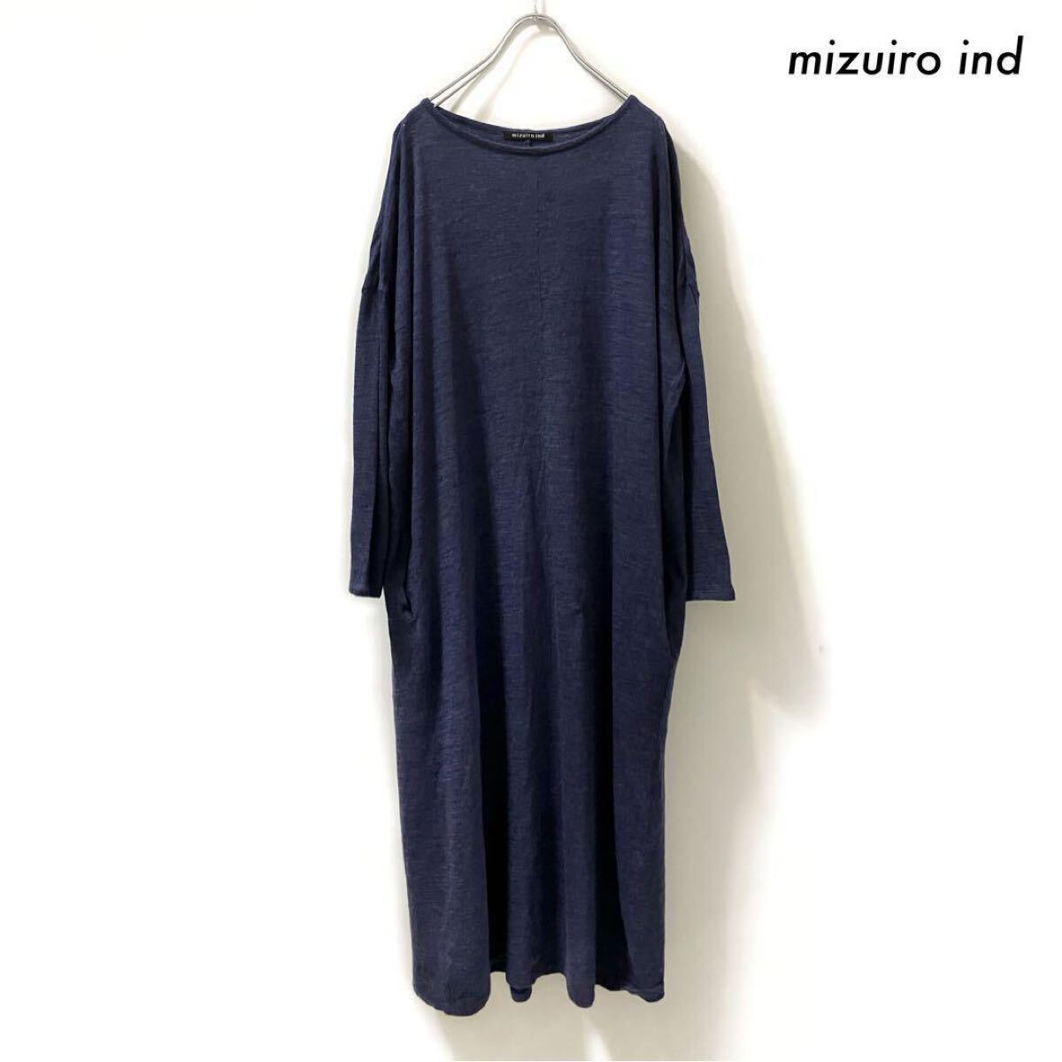 - 【送料無料】mizuiro ind ミズイロインド★長袖ワンピース 薄手ウール 杢ネイビー 紺