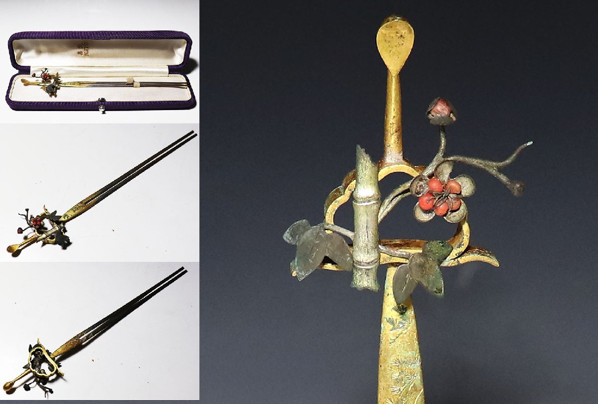 - 【桃】アンティーク髪飾り:金工銀地鍍金銀に珊瑚松竹梅図簪
