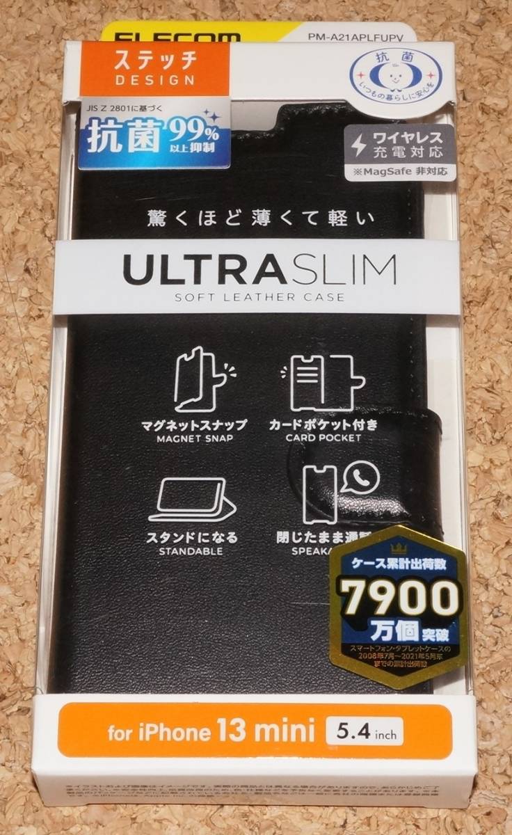 > ★新品★ELECOM iPhone13mini レザーケース Ultra Slim ステッチ 抗菌 ブラック