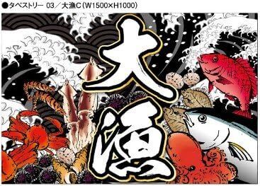 > タペストリー横断幕「大漁旗C 新鮮魚介 荒波 大海原 商売繁盛 千客万来 北海道 お持ち帰り 大漁祭 生鮮市場 寿司 刺身」何枚でも送料360円