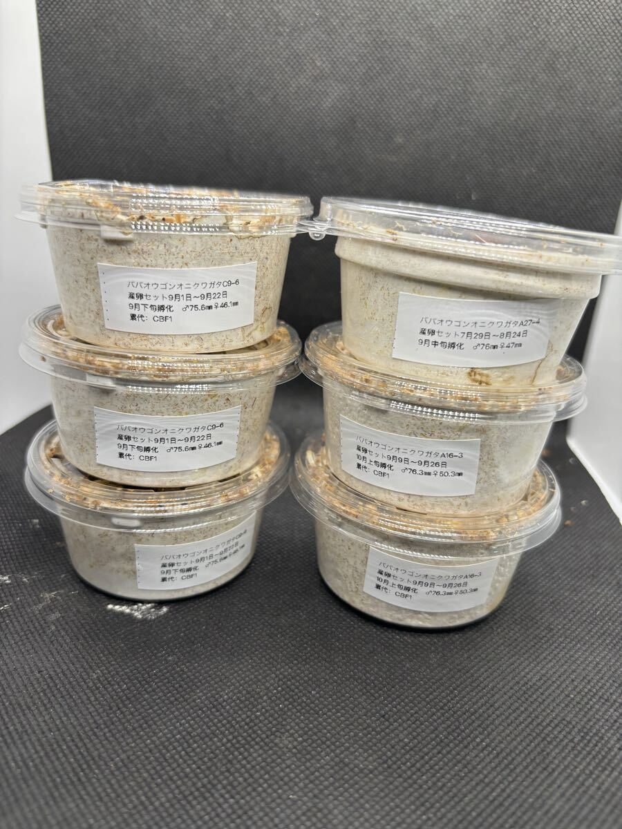 > ババオウゴンオニクワガタ ♂76㎜♀47㎜からの幼虫1頭、♂75.6㎜♀46.1からの幼虫3頭、♂76.3㎜♀50.3からの幼虫2頭合計6頭。
