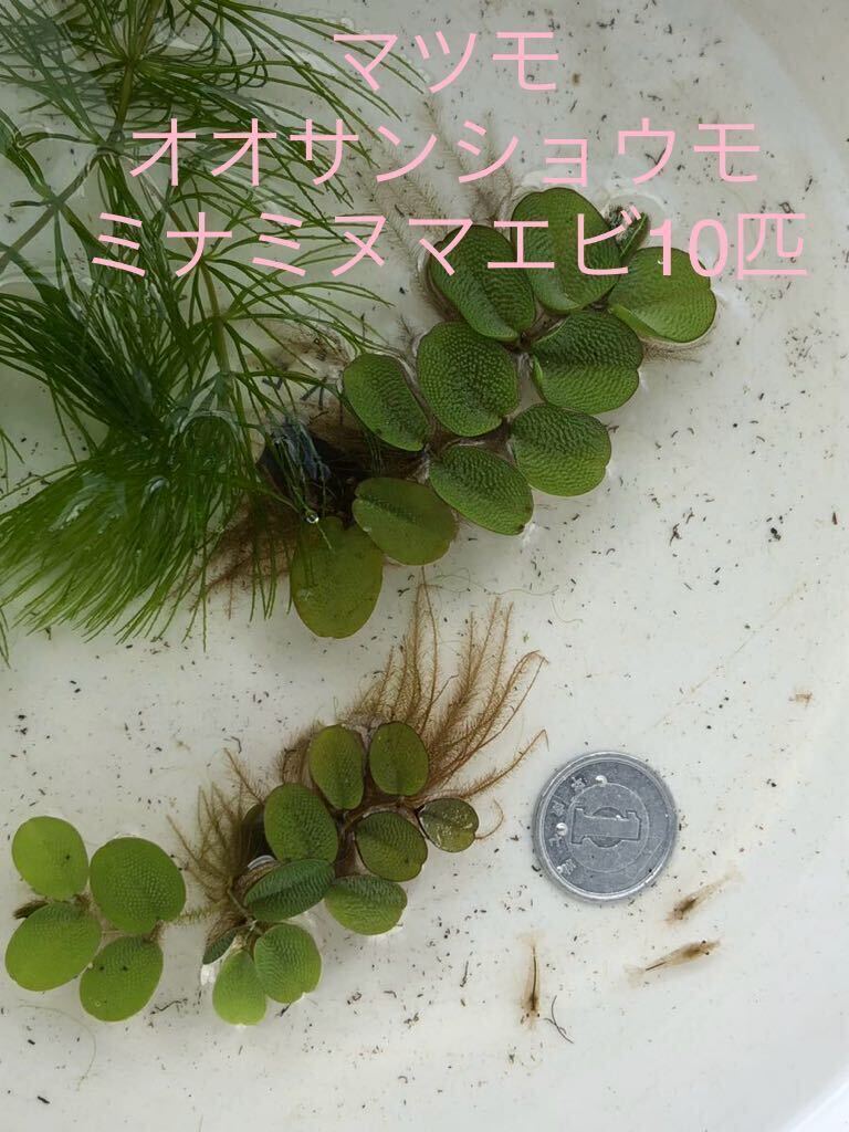 > 送料無料①ミナミヌマエビ10匹 ②マツモ1本(約10cm) ③浮き草オオサンショウモ のセット 厚さ3cmのダンボール梱包 匿名発送 追跡可能