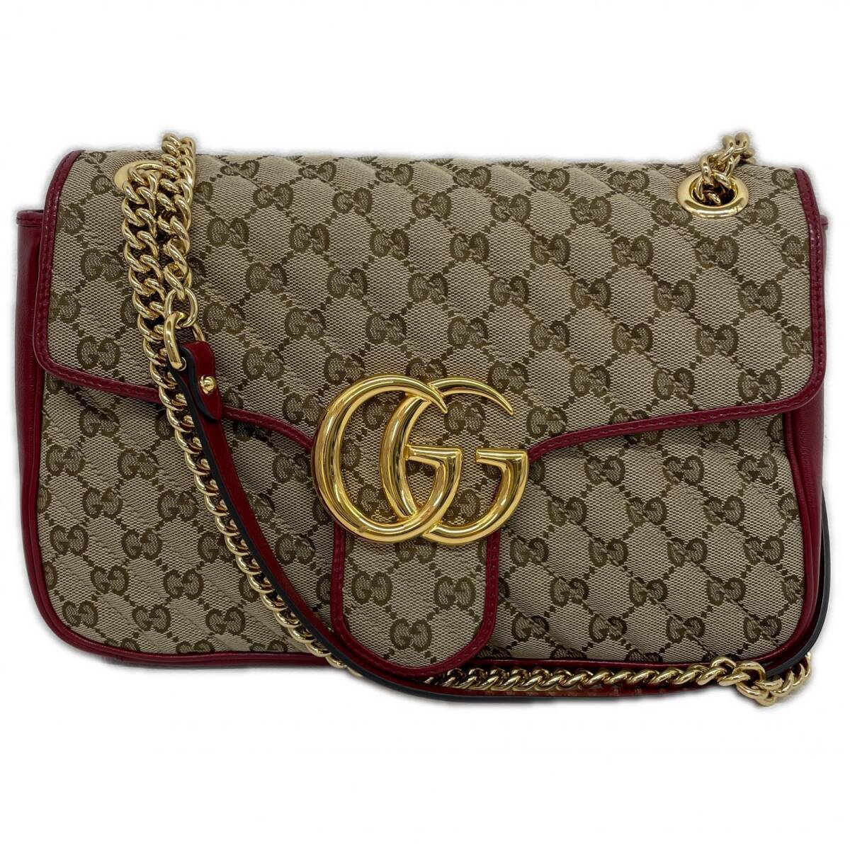 > 美品 グッチ チェーンショルダーバッグ GGマーモント キャンバス レザー ベージュ レッド 赤 GUCCI 中古 ◆2008