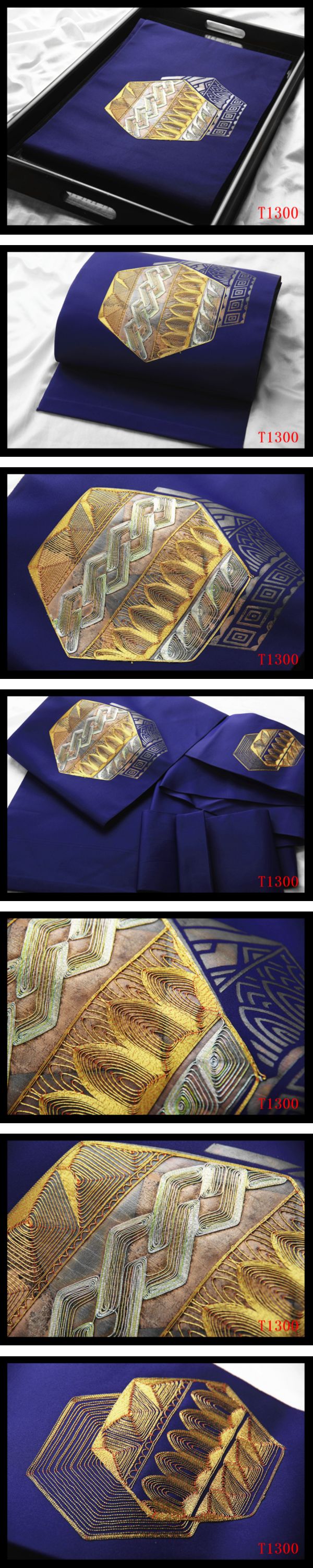 - 蔵【T1300】厳選逸品 金駒刺繍 亀甲紋 紺藍色地 気品豊かに 正絹純金糸高級美術名古屋帯 ◇検簪着物袋帯和装小物帯締め