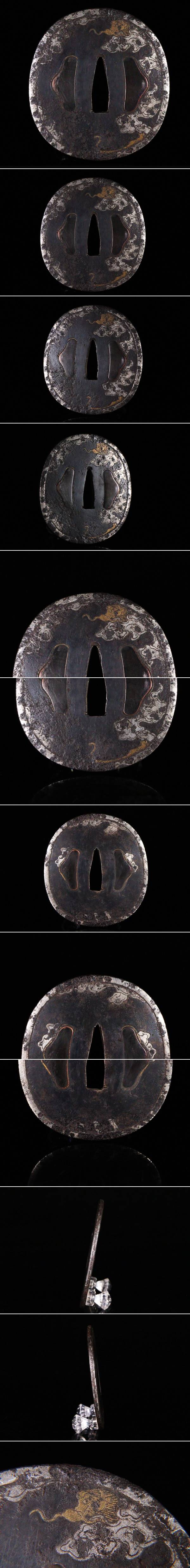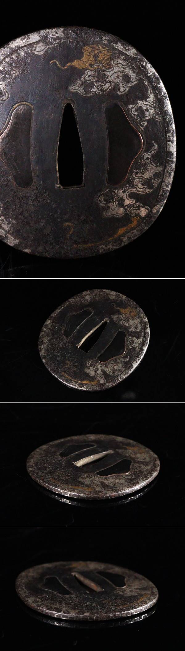 > 【ASAHI】時代 肥後 鉄地 金銀象嵌 龍文鍔 7.5cm 細密細工 刀装具 時代武具 コレクター収蔵品[78221qu]