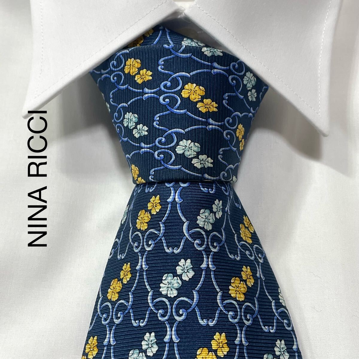 - NINA RICCI ニナリッチ パターン柄 シルク ネクタイ フランス製 ネイビー TG2978