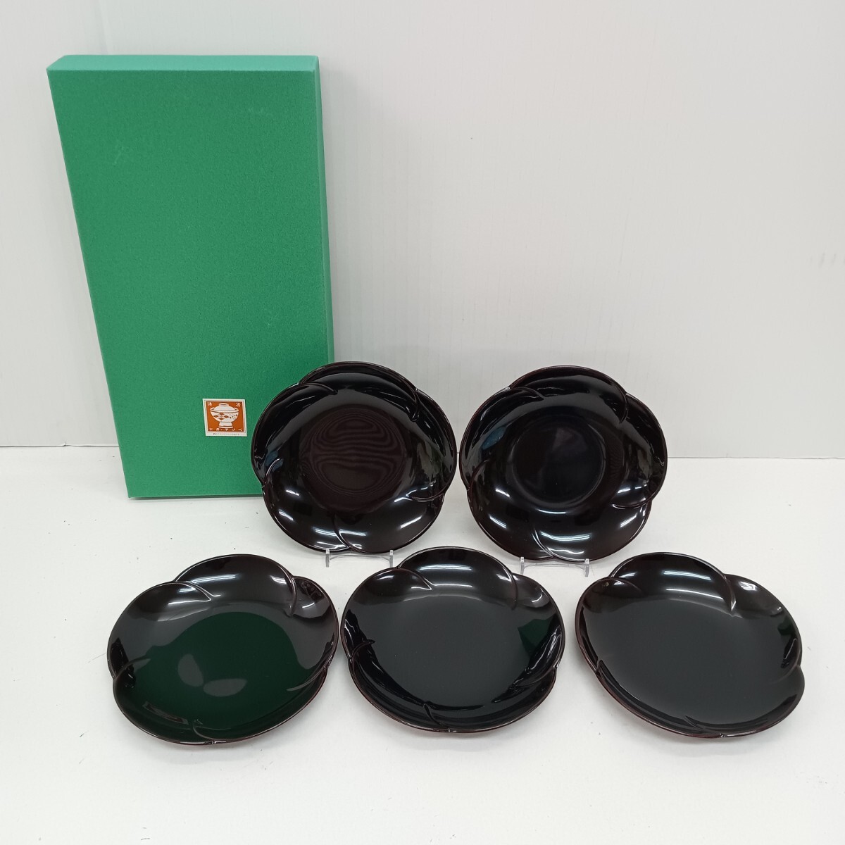 - 268 菓子皿 銘々皿 茶托 小皿 梅花皿 5枚セット まとめて 漆器 漆芸 茶器 茶道具 食器 和食器