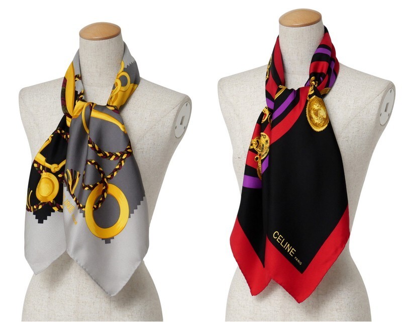 > TJ5027*VINTAGE CELINE セリーヌ 2点セット サークルロゴ スターボール チェーン柄 大判シルクスカーフ ストール フランス製