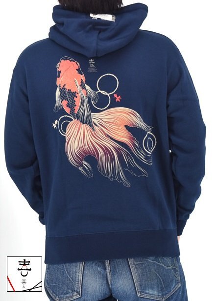 - 金魚の厚手裏毛プルパーカー◆喜人 ネイビー XXLサイズ KJ-52301 和柄 和風 きんとと スウェット きじん