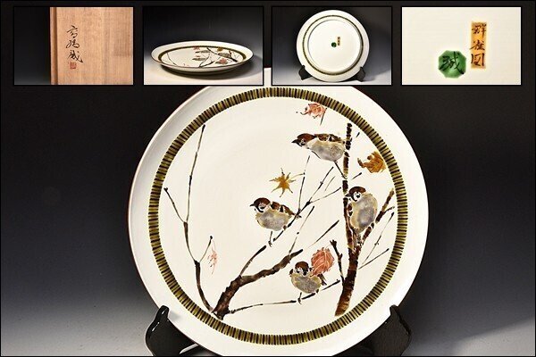 > U08730 東京芸大 高橋誠 色絵 紅葉に群雀図 大皿 共箱 色絵磁器 /3F