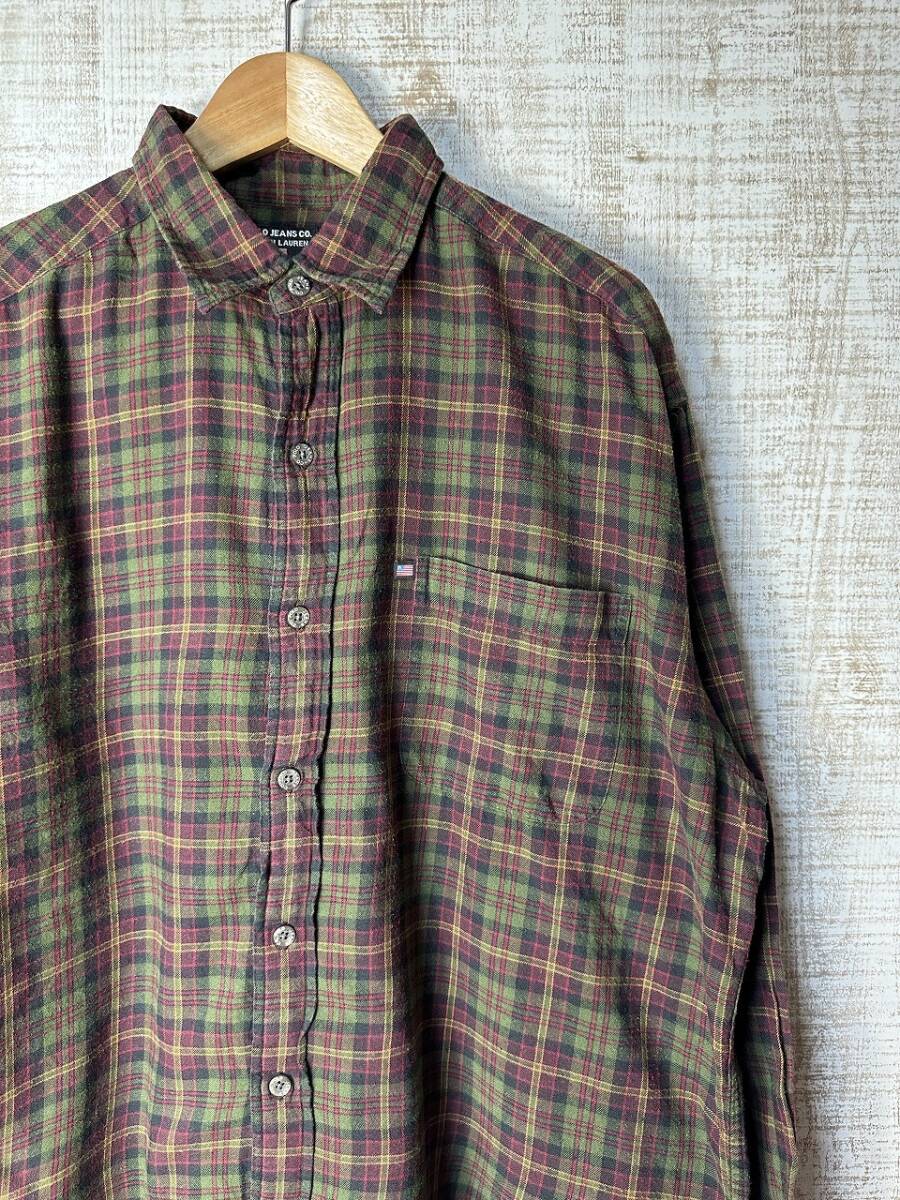 - ☆US古着 POLO JEANS Ralph Lauren ラルフローレン ネルシャツ チェック柄 長袖シャツ グリーン緑×レッド赤×黒【L】コットン ◆5294◆