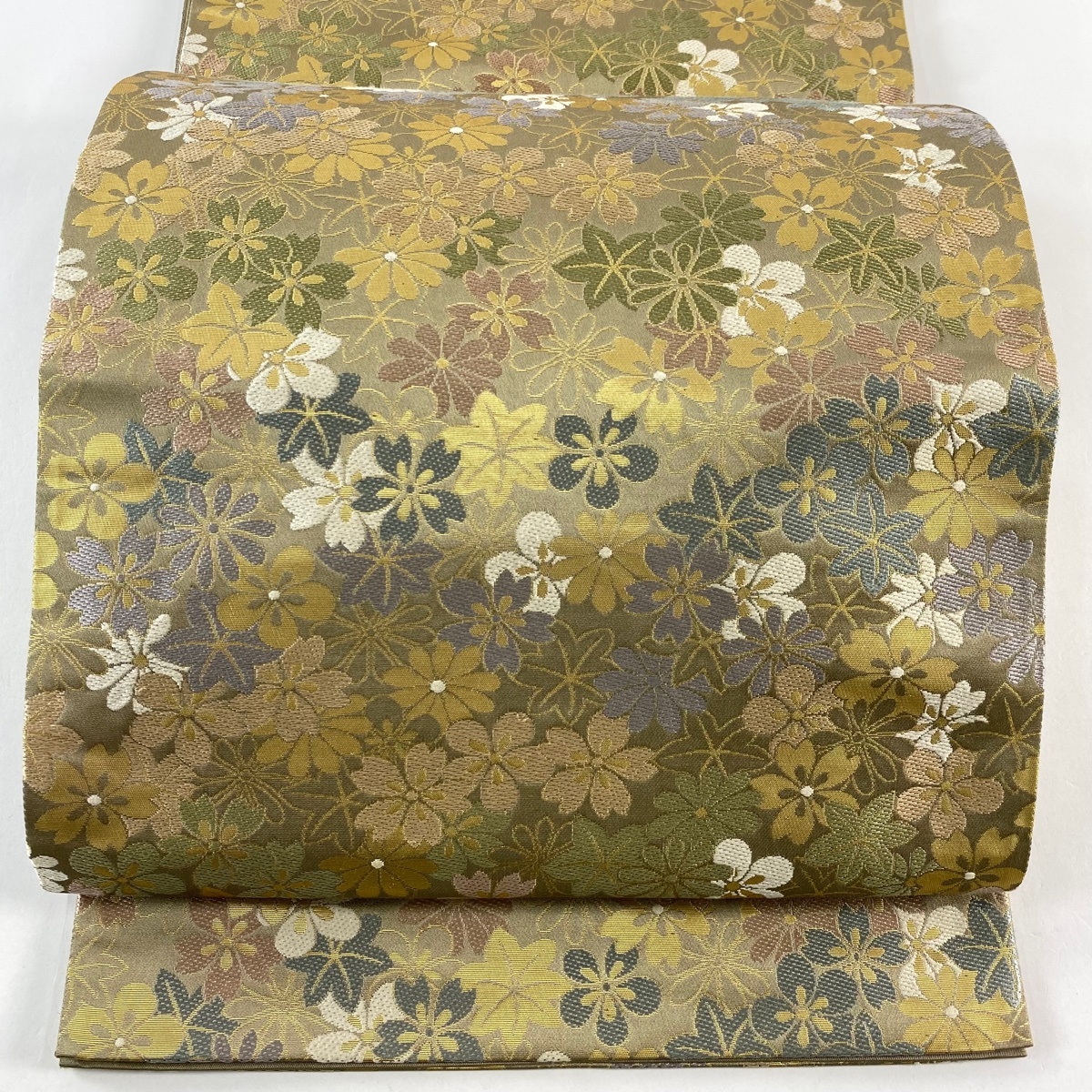 - 【美品】 袋帯 名品 箔屋清兵衛 落款 草花 箔 草木染 薄黄土色 六通 正絹 【中古】