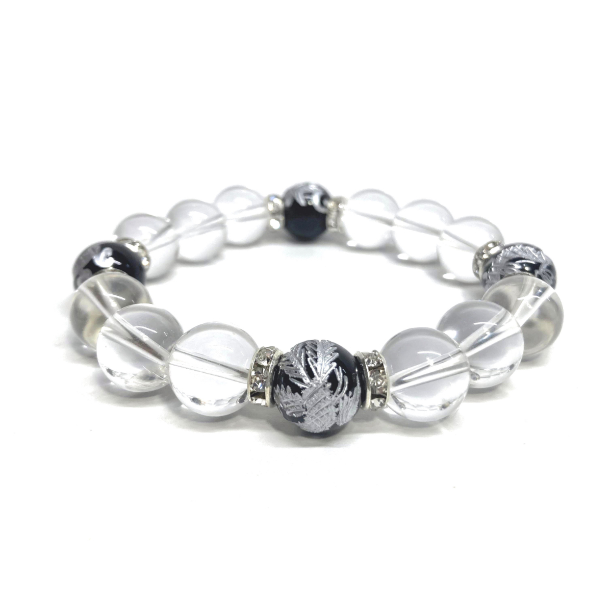 - 四神獣銀彫オニキス×水晶 12mm パワーストーン ブレスレット天然石 青龍 白虎 玄武 朱雀 運気上昇 開運 金運 お守り 四神獸 四神相応 S