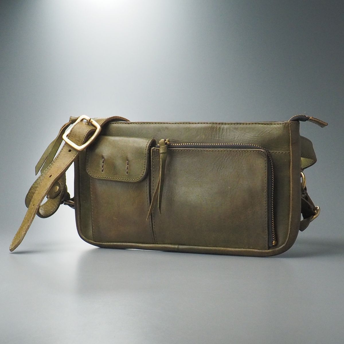 - MI1906◎Ryu リュウ 本革 レザー ウエストバッグ ウエストポーチ 薄マチ 鞄 オリーブグリーン系 メンズ