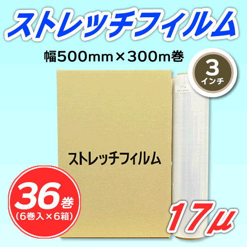 - 【36巻】ストレッチフィルム 幅500mm×300m巻 17μ 3インチ紙管 (代引不可)※法人様限定