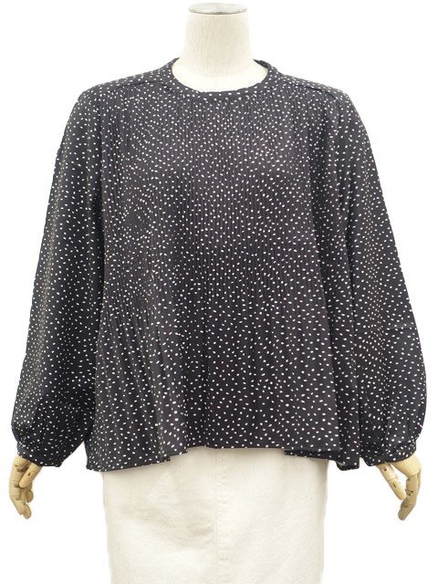 > 新品タグ付 グリッツッアーン Glitgern パフスリーブ 長袖 ラウンドネック プルオーバーブラウス M ブラック地 ホワイト ドット柄