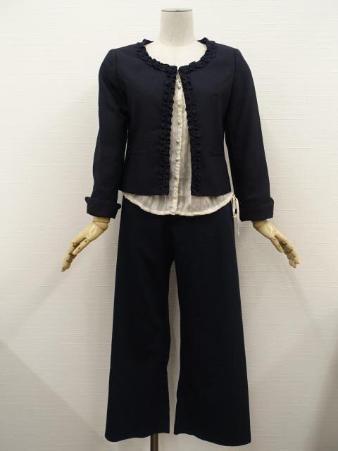 > 美品 Zelal Sport等 長袖 ノーカラージャケット+ブラウス+ワイドパンツ コーデ3点セット S 紺/ベージュ ストライプ きれいめ系 20代~30代