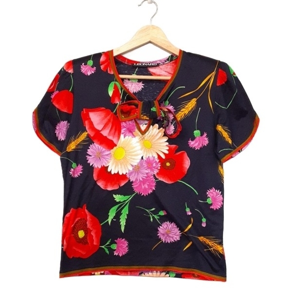 > レオナール LEONARD 半袖カットソー サイズS - ダークネイビー×レッド×マルチ レディース クルーネック/花柄/リボン/肩パッド 美品