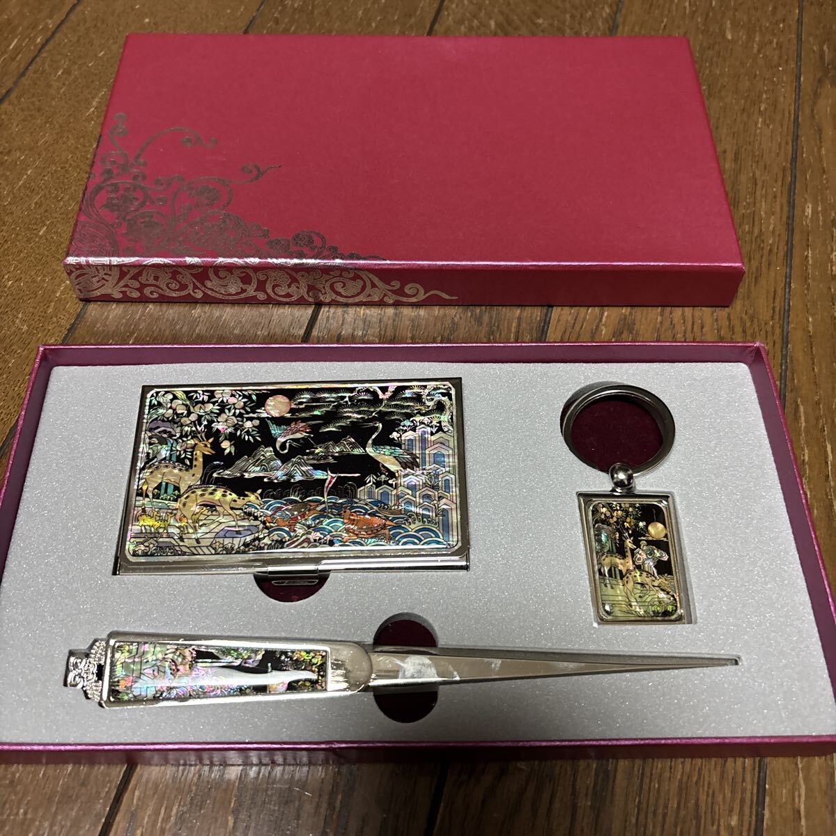 - 送料無料 韓国 螺鈿細工 螺鈿 名刺入れ キーホルダー ペーパーナイフ 未使用品 鶴 鹿