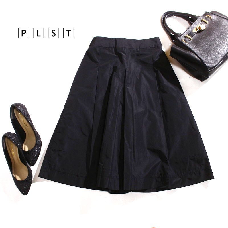 > 美品 セオリー Theory プラステ PLST ナイロン質感 艶 フレアスカート M号 ブラック 黒 スカート 上品 オフィス 通勤 綺麗め ポリエステル