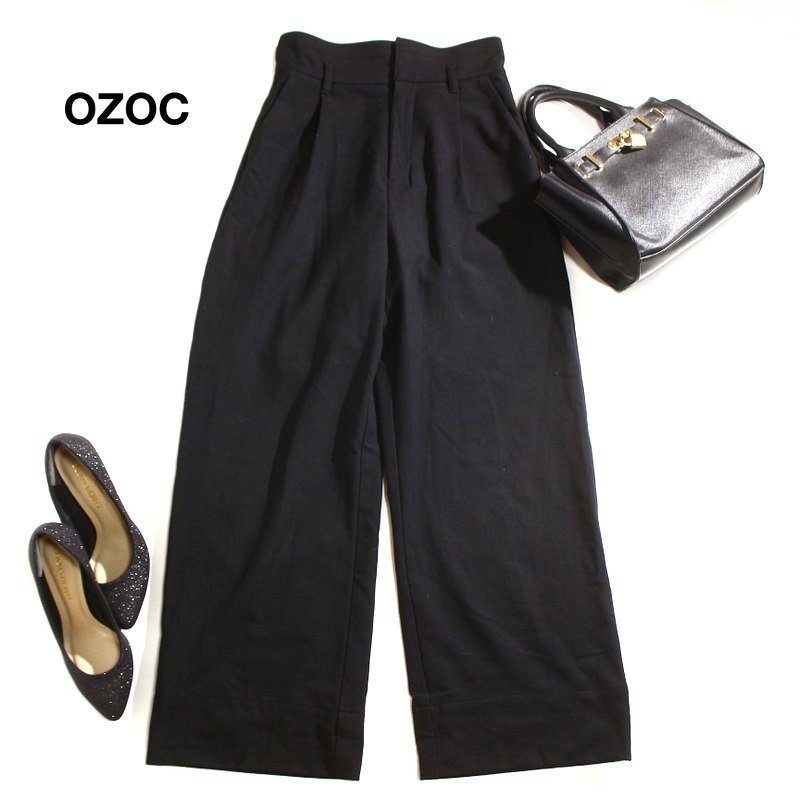> 美品 ozoc オゾック 株) ワールド 秋 冬 ポリエステル 美脚 ハイウエスト パンツ 9号 38 ブラック 黒 ワイドパンツ オフィス 綺麗め 起毛