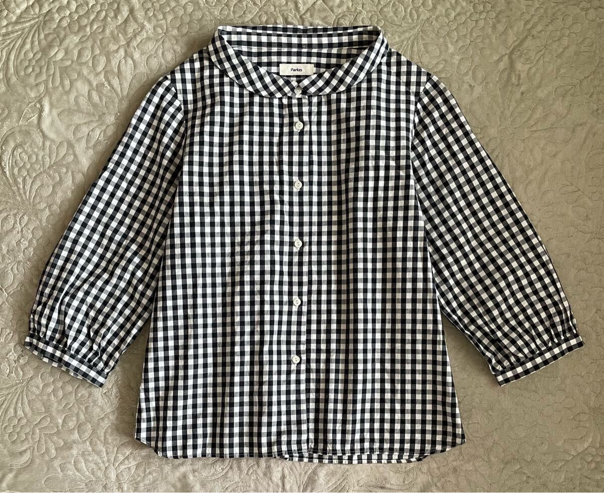 - parkes ギンガムチェック ブラウス 丸襟 七分袖 ちび襟 黒白 綿100% ギャザー コットン パークス M 日本製
