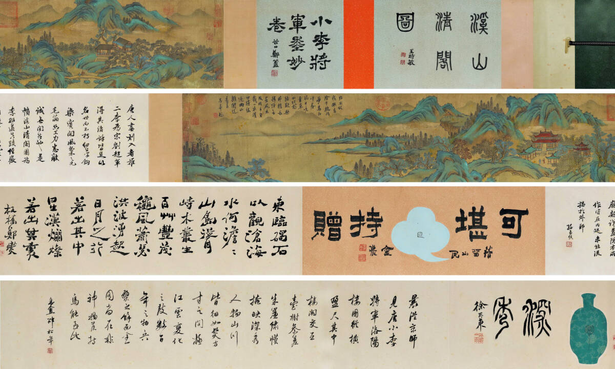 - ▽鴻▽古書道【唐代書画家 李昭道書 絹本 渓山清閣図長巻】 真筆肉筆 骨董書画 掛け軸 時代物 中国古美術 骨董品