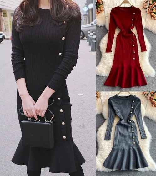 - ニットワンピース 厚手 フリル きれいめ オフィスカジュアル かわいい 秋冬 M ワインレッド