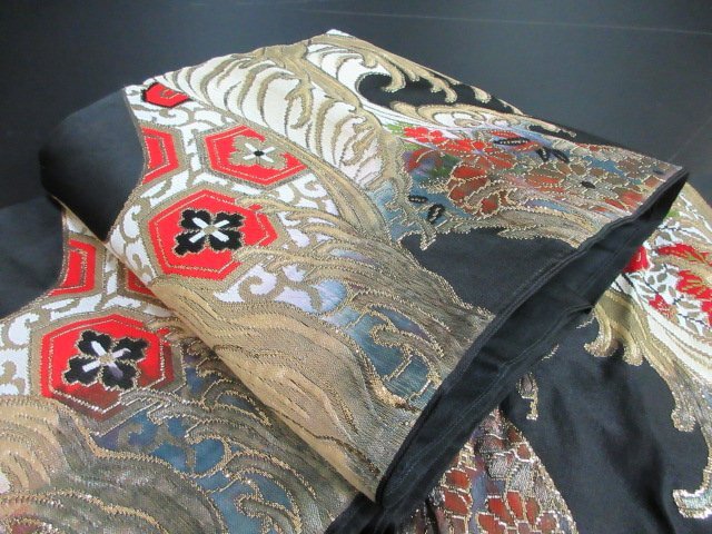 > 1円 良品 袋帯 正絹 和装 和服 波 亀甲 唐草 桐 草花 お洒落 六通柄 長さ384cm【夢職】★