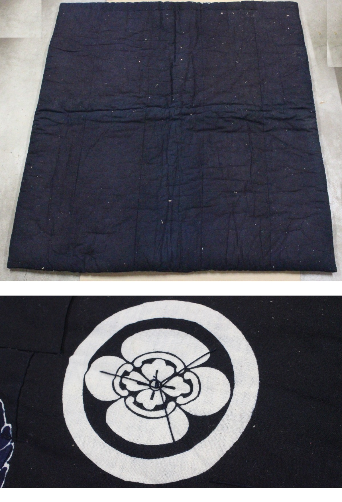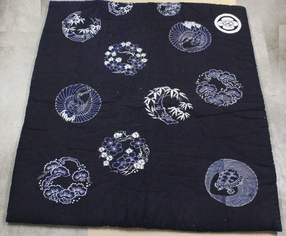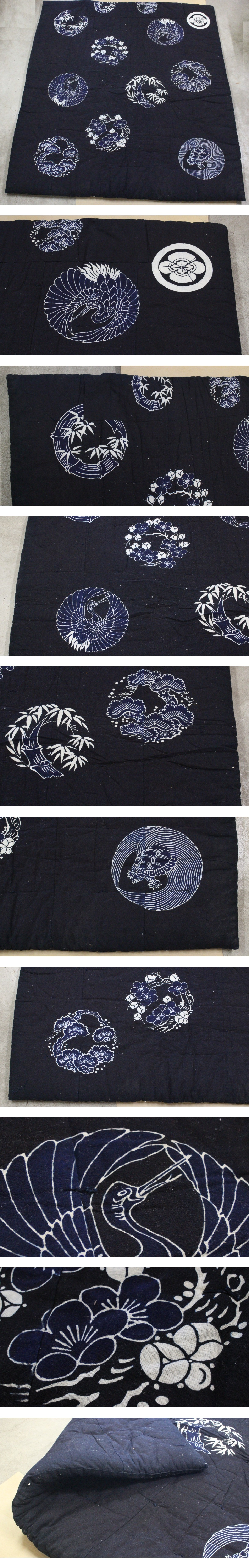 - 藍染木綿 家紋鶴亀松竹梅 5幅布団皮 綿入り 時代物 日本古布アンティーク生地 チ25