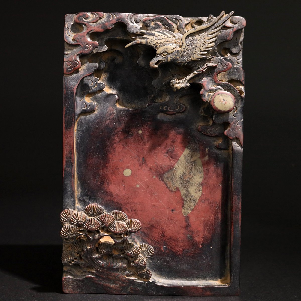 - 【安】清時代 董誥銘 端石彫 松鷹紋硯 端渓硯 書道具 文房具 極細工 中国古美術 時代物 古董品 305