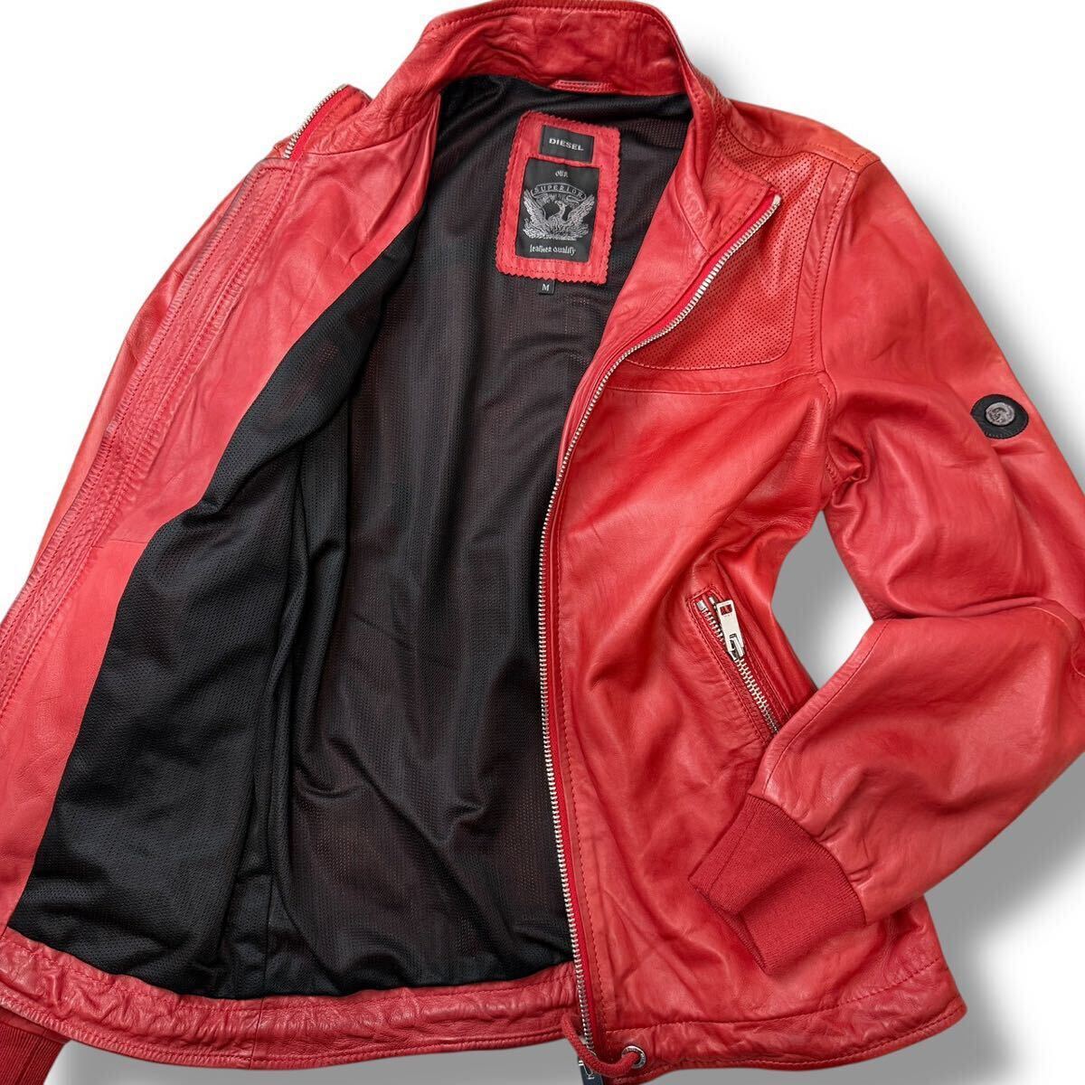 - 1198美品/L相当●DIESEL ディーゼル ラムレザー ライダース ジャケット 羊革 パンチング 裏地メッシュ 通気性◎ブレイブマン金具 レッド 赤