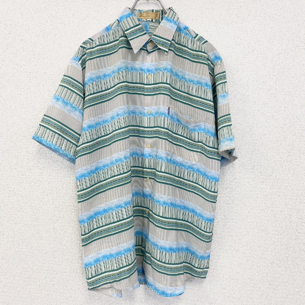 - 古着 used 半袖プリント総柄シャツ レトロデザイン エスニック ストライプ柄 胸ポケット 青 緑 ブルー グリーン
