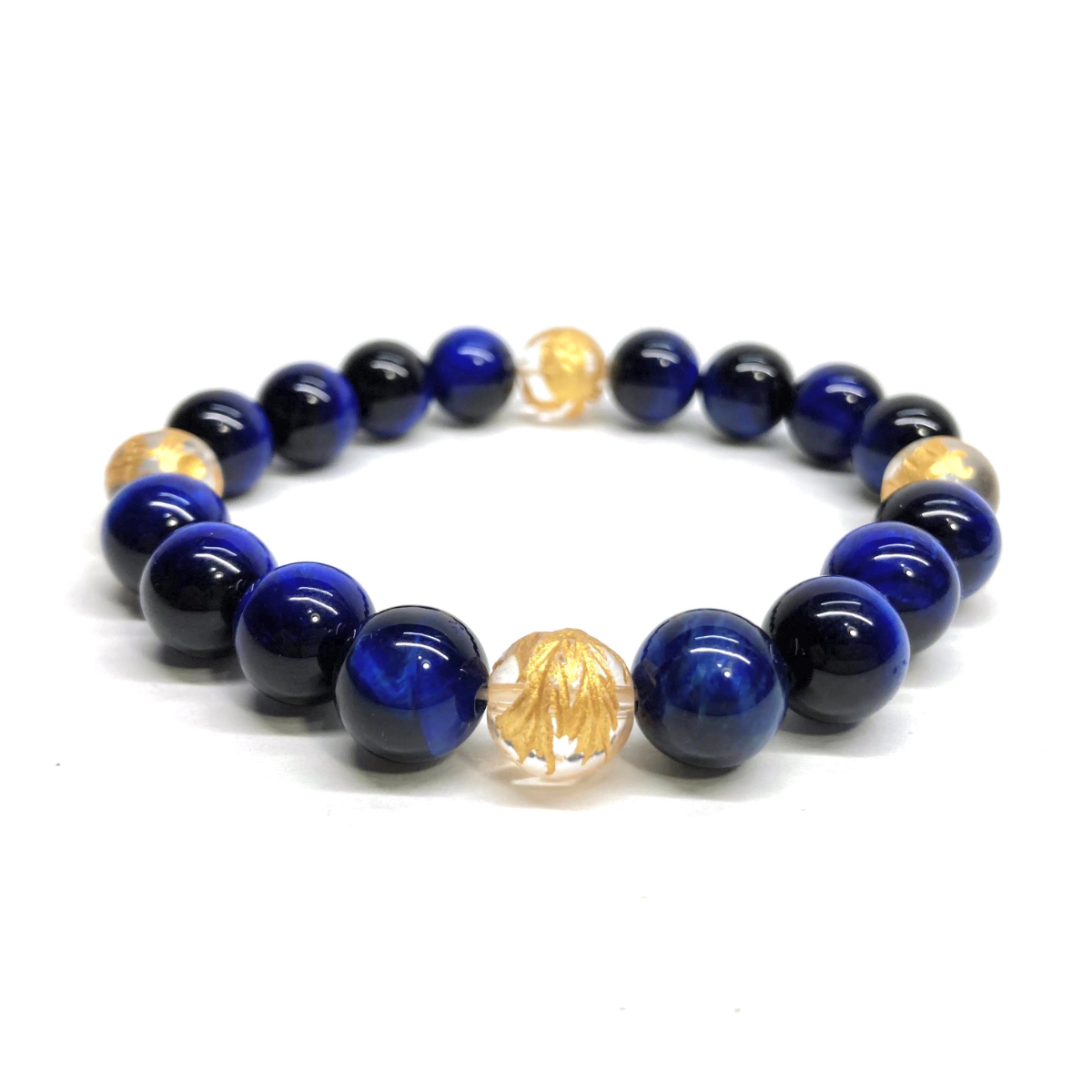 - 10mm 四神獣金彫水晶×ブルータイガーアイ パワーストーン ブレスレット天然石 運気上昇 開運 金運 恋愛運 青龍 白虎 玄武 朱雀 ☆