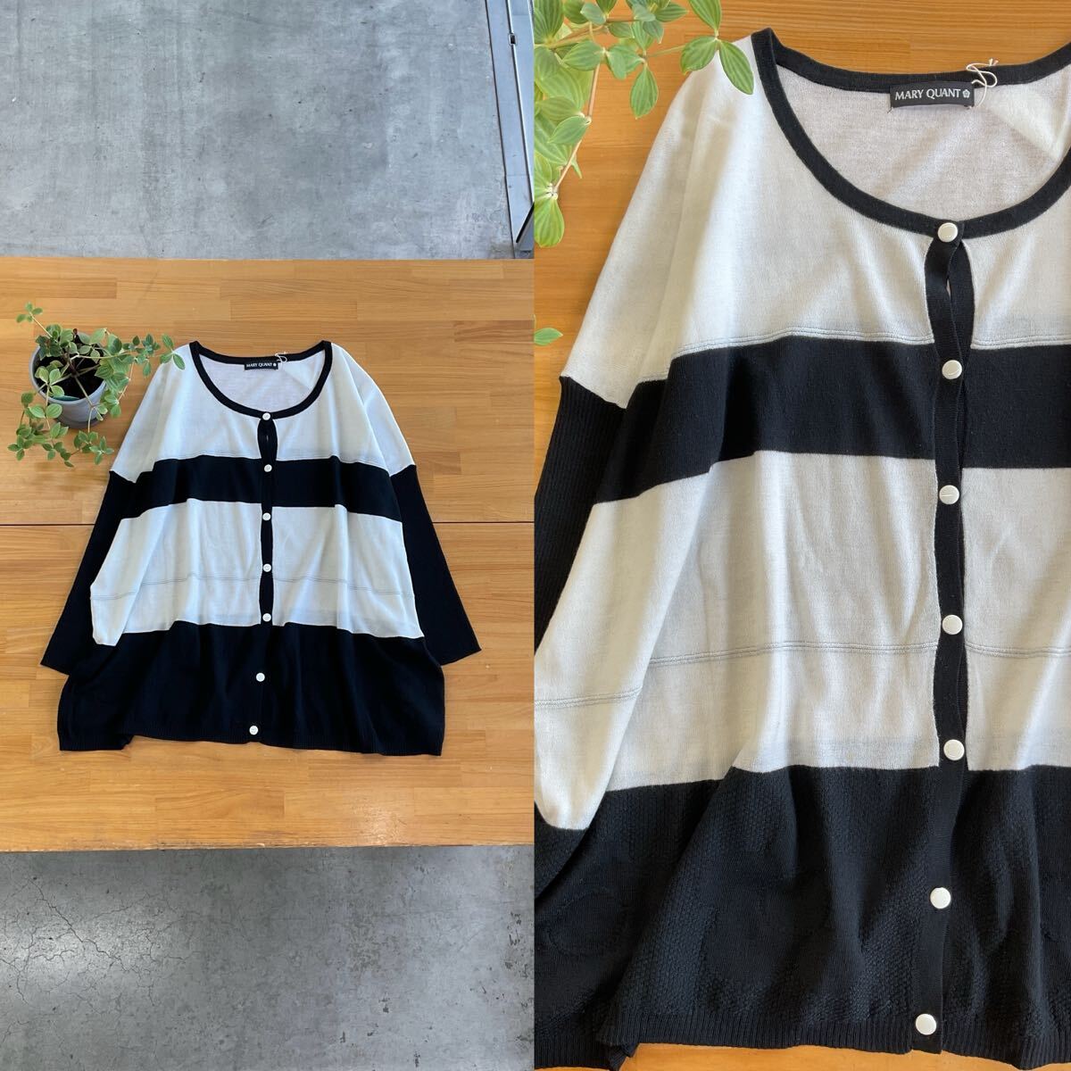 > MARY QUANT マリークワント ワイドシルエットボーダー柄カーディガン ラメライン裾花柄袖リブ長袖羽織 モノトーン ブラック黒白色系 M q
