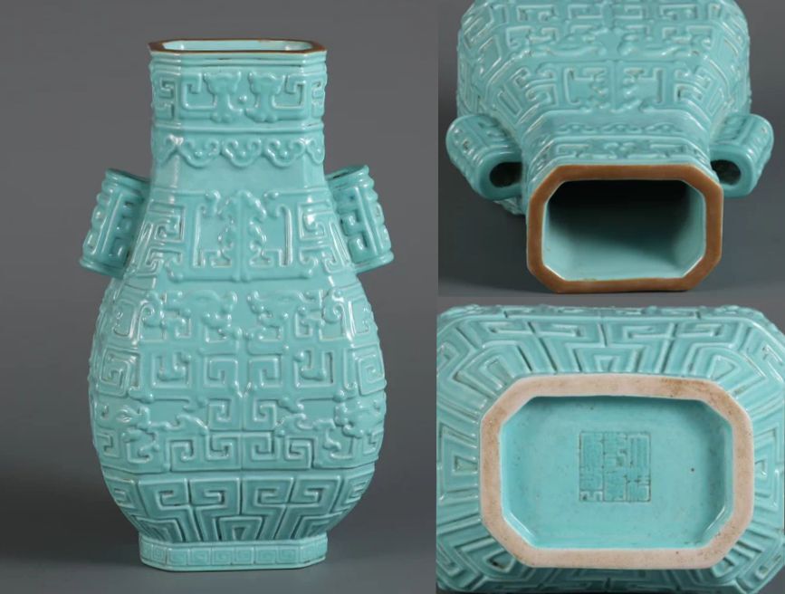 - ●大清乾隆年製款 綠松石釉 双耳花瓶 陶磁器 骨董品 中国美術●