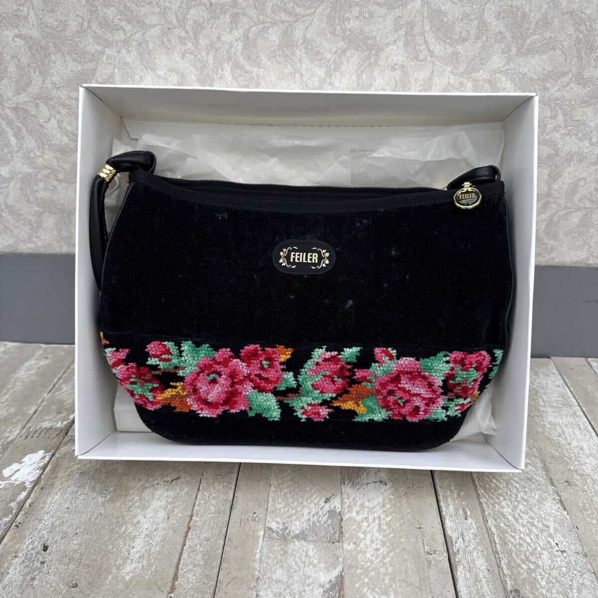 - FEILER 黒 花柄刺繍 手提げバッグ 美品