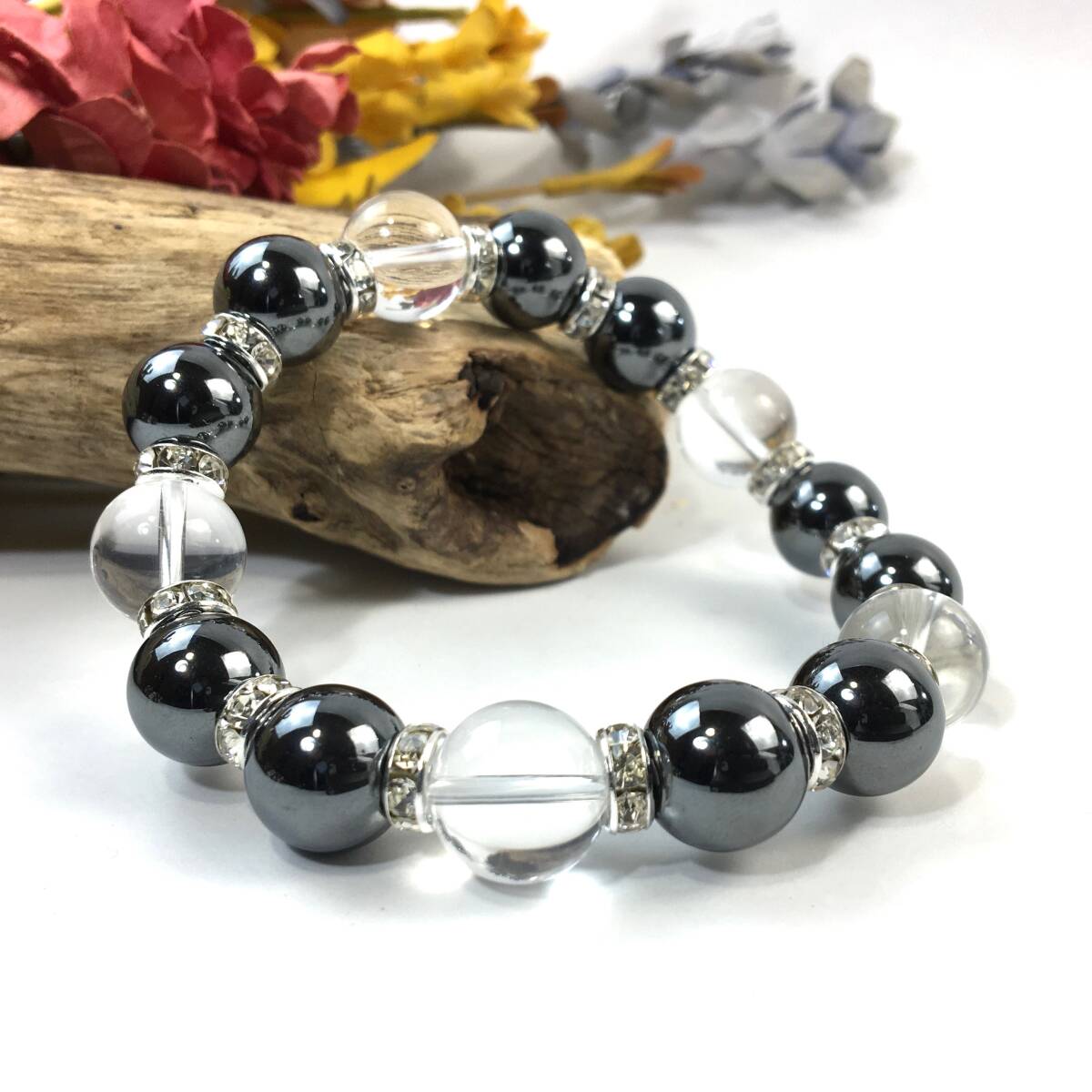 - ヘマタイト&水晶 パワーストーン ブレスレット 天然石ブレス (シルバー) 12mm 幸運 開運 メンズ 男性♪