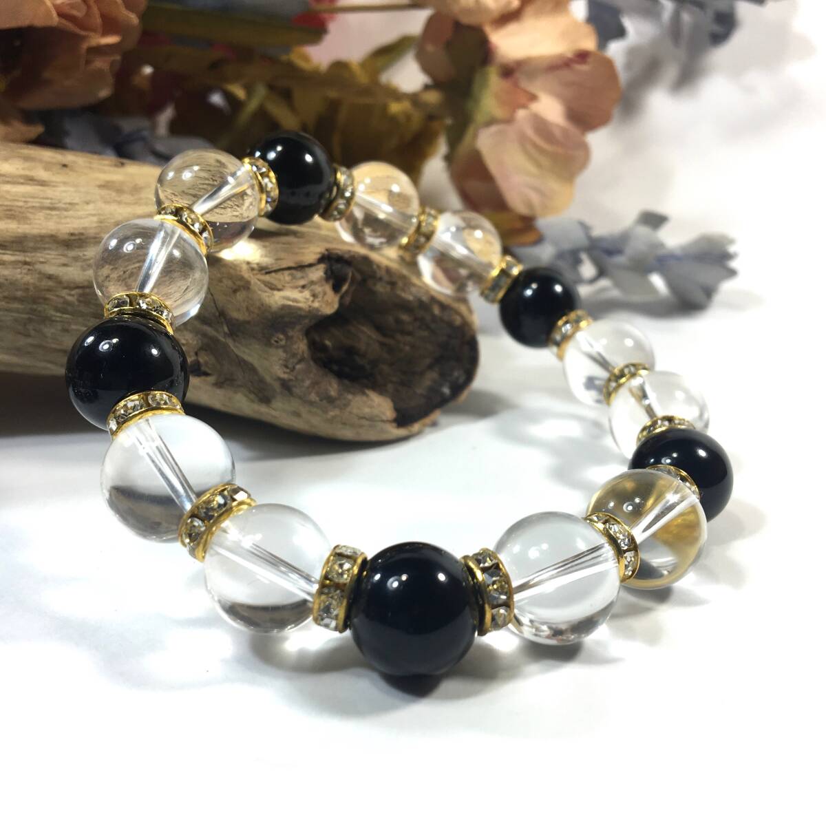 - 水晶&オニキス パワーストーン ブレスレット (ゴールド) 12mm 幸運 開運 メンズ 男性♪