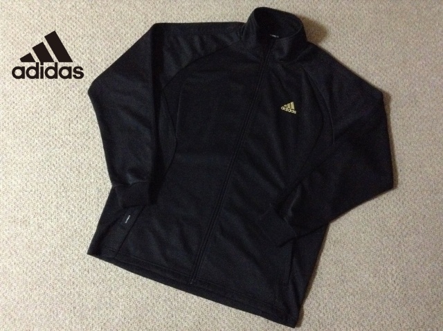 > ★美品★アディダス CLIMALITE メンズ ジャージジャケット Oサイズ 黒 ブラック ゴールド ワンポイント 刺繍ロゴ adidas 古着