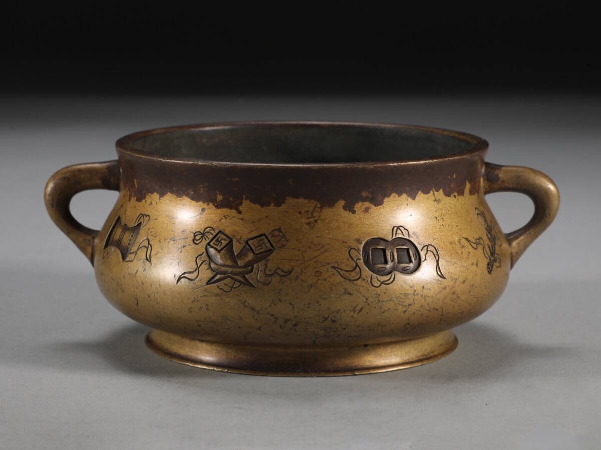 - ▽鴻▽明朝時代 古銅彫 雑宝紋蚰龍耳炉 双龍抱大明宣徳年製 時代物 中国古美術 骨董品