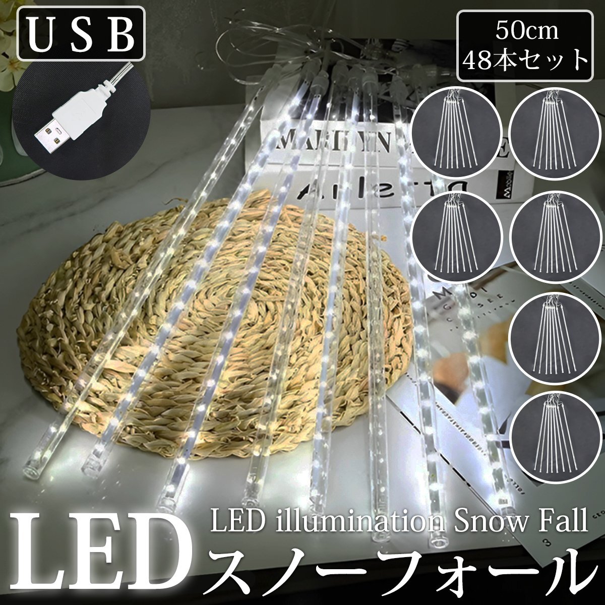 > 【KR-12-6】流れるLEDイルミネーション スノーフォール つらら 50cm 48本セット USB ホワイト お家時間 防水 ベランダ 屋内 屋外 冬