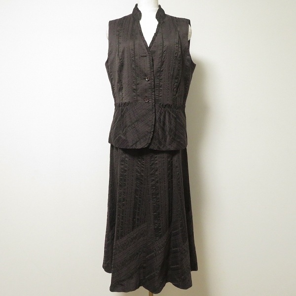 - #anc レリアン Leilian セットアップ ツーピース 茶 シルク混 ストライプ フリル ノースリーブ ロング レディース [969439]