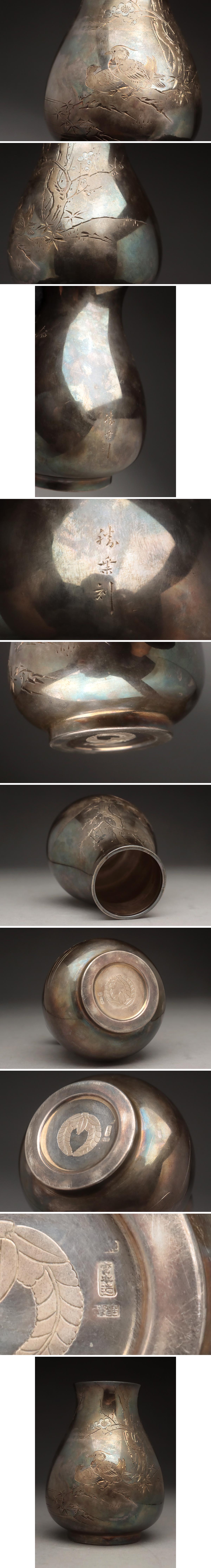 - FD238 時代金工【宮本造/勝乗刻】純銀小壷 高9.2cm / 重93g 純銀刻・純銀片切彫梅竹鴛鴦図小花瓶・小壺・小瓶 古美術