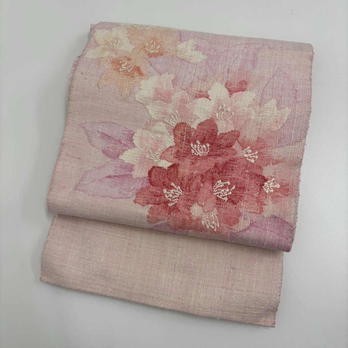 - 真綿紬 名古屋帯 正絹 素敵な花の織柄 八寸Q-227