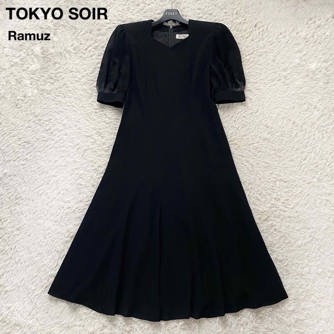 > 【美品】Ramuz 東京ソワール 冠婚葬祭 喪服 礼服 フレアワンピース 花柄刺繍 五分袖 ハーフスリーブ 9号 TOKYO SOIR